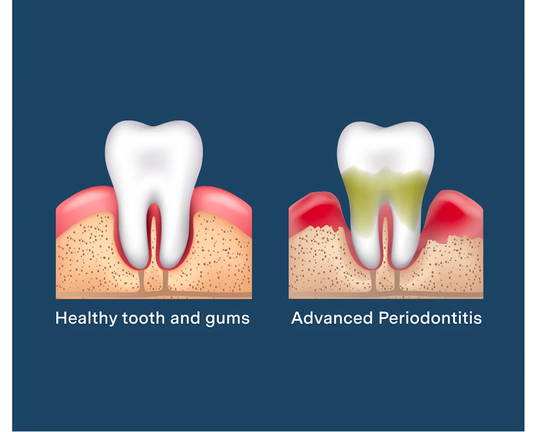 As seen here, periodontal disease is the final stage of gum disease. If left untreated, the gums can eventually pull away from the teeth, creating pockets that become infected, resulting in periodontitis. This can ultimately lead to tooth loss and other oral health problems.